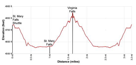 Shuttle Bus Directions: From the intersection of Highway 89 and the Going-to-the-Sun Road, drive 0.5 miles to the St. Mary Visitor Center and park. Take the Glacier Shuttle Bus, starting at the St. Mary Visitor center to the St. Mary Falls stop. Shuttle buses run approximately every 15 minutes. Check at the Visitor Center for the most up-to-date information.
