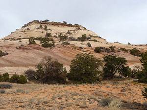 From the parking area the sandy trail heads northeast on easy grades through desert scrub, passing to the right (south) of the first sandstone dome. After walking just over 0.3 miles the trail reaches a “Y” intersection. The path branching to the left climbs the first dome while the trail to the right heads toward Aztec Butte. Bear right, continuing along the main trail as it ascends on gentle grades toward Aztec Dome.