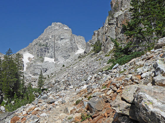 Most hikers stop at the boulder field, well satisfied with the breathtaking views of the peaks. Parties comfortable with strenuous, off-trail scrambling must plot their own course through the labyrinth of boulders to reach “The Meadows”, a camping area for climbers, surrounded by a massive granite cirque anchored by Middle Teton.