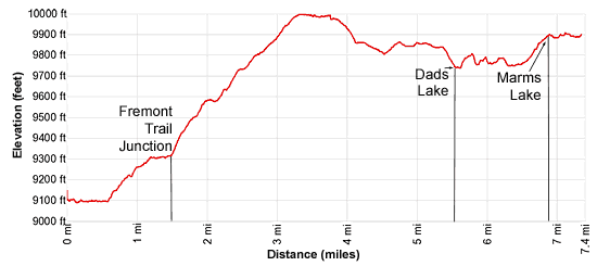 At the north end of Dads Lake travels through a marshy meadow, crossing the lake’s inlet stream along the way. Past the meadow the path climbs on moderate grades up a narrow, rocky draw along the left (west) side of a stream. At the top of the draw the trail drops slightly to reach the south end of Marms Lake (9,878-ft.) at 6.8 miles. Good campsites around the lake are in short supply. The best spots are above the south and north ends of the lake. Unless you are exhausted, my advice is to continue beyond Marms to find a good campsite.